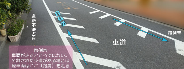 ここは自転車が走るべき場所を示す線が書かれてないが、書かれているところだって守りゃしねぇ。そもそも歩道を走れる例外が生じてないのに歩道を走るからな。