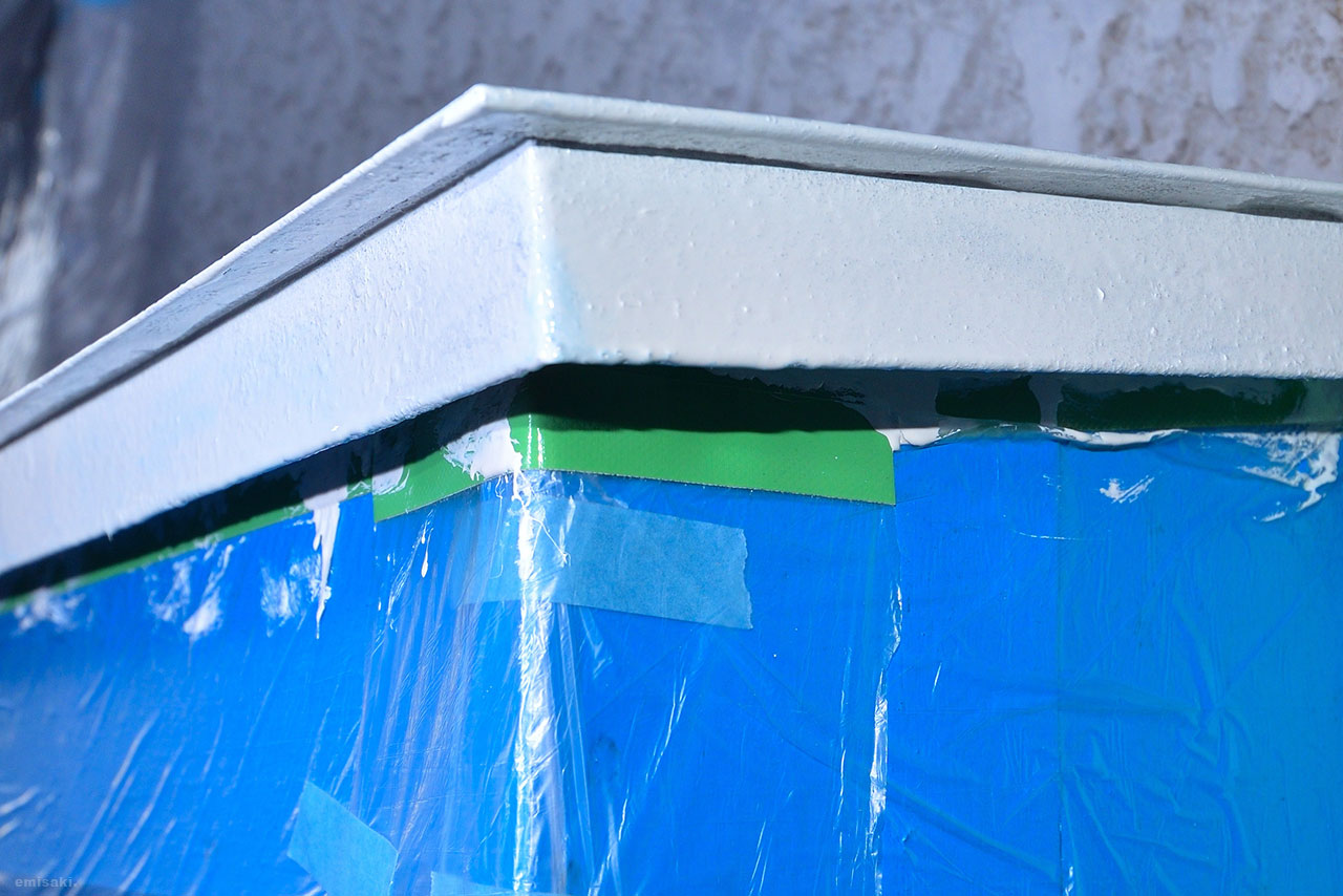 細いハケでは時間がかかりすぎるため小さくても幅は20mmくらいで厚みがある。はみ出すのは想定していたため養生テープを正確に貼るため多くの時間をかけた。指やテープ自体に隠れて見えないところ真っ直ぐに貼れるとは限らず何度も張り直した。