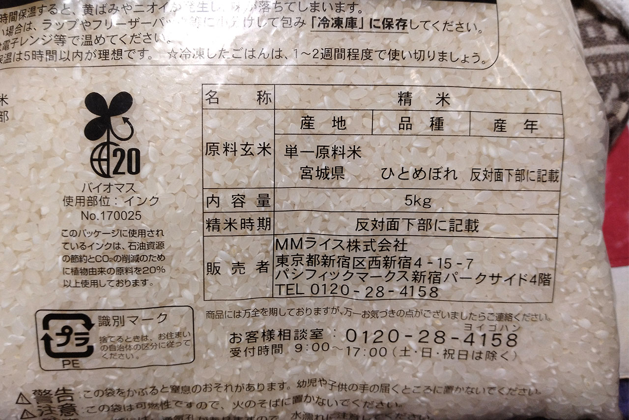・宮城県産ひとめぼれ 5kg 税込4,298円(税抜3980円)
