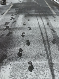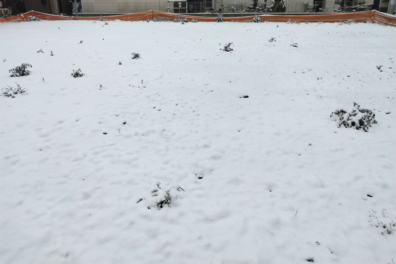 事前対策を忘れた。通路に板やシートを張っておいて、そこに積もった雪を一気に取り除くことを以前にはやっていた。滅多に雪が降らないため忘れてた。今からでもブルーシートを敷いておく。