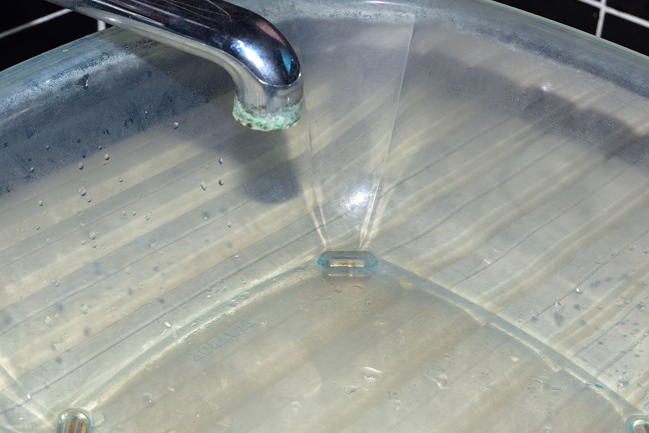 前回パッキンを交換してから強く閉めないとポタポタたれるのが止まらなかったが、結果、それほど強く締め付けなくても水が止まるようになった。念のため洗面器を置いて水が出て溜まらないか調べる。